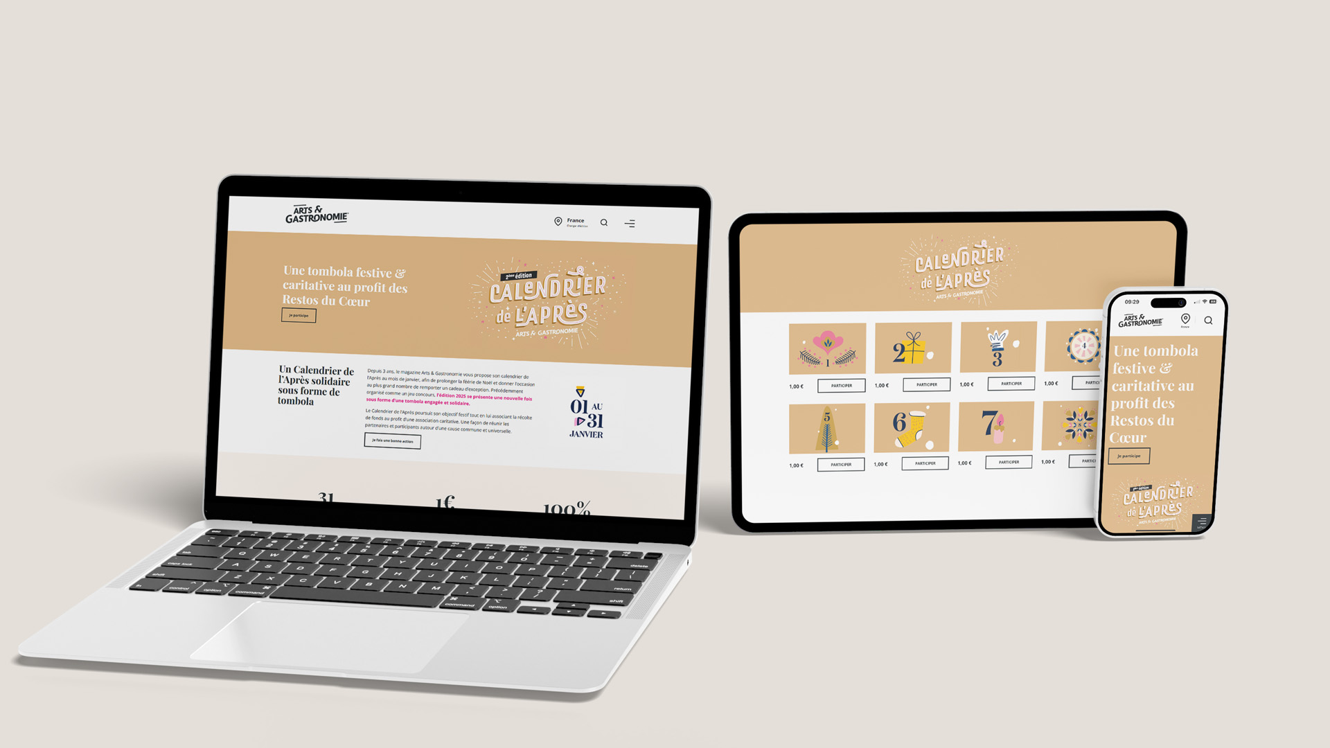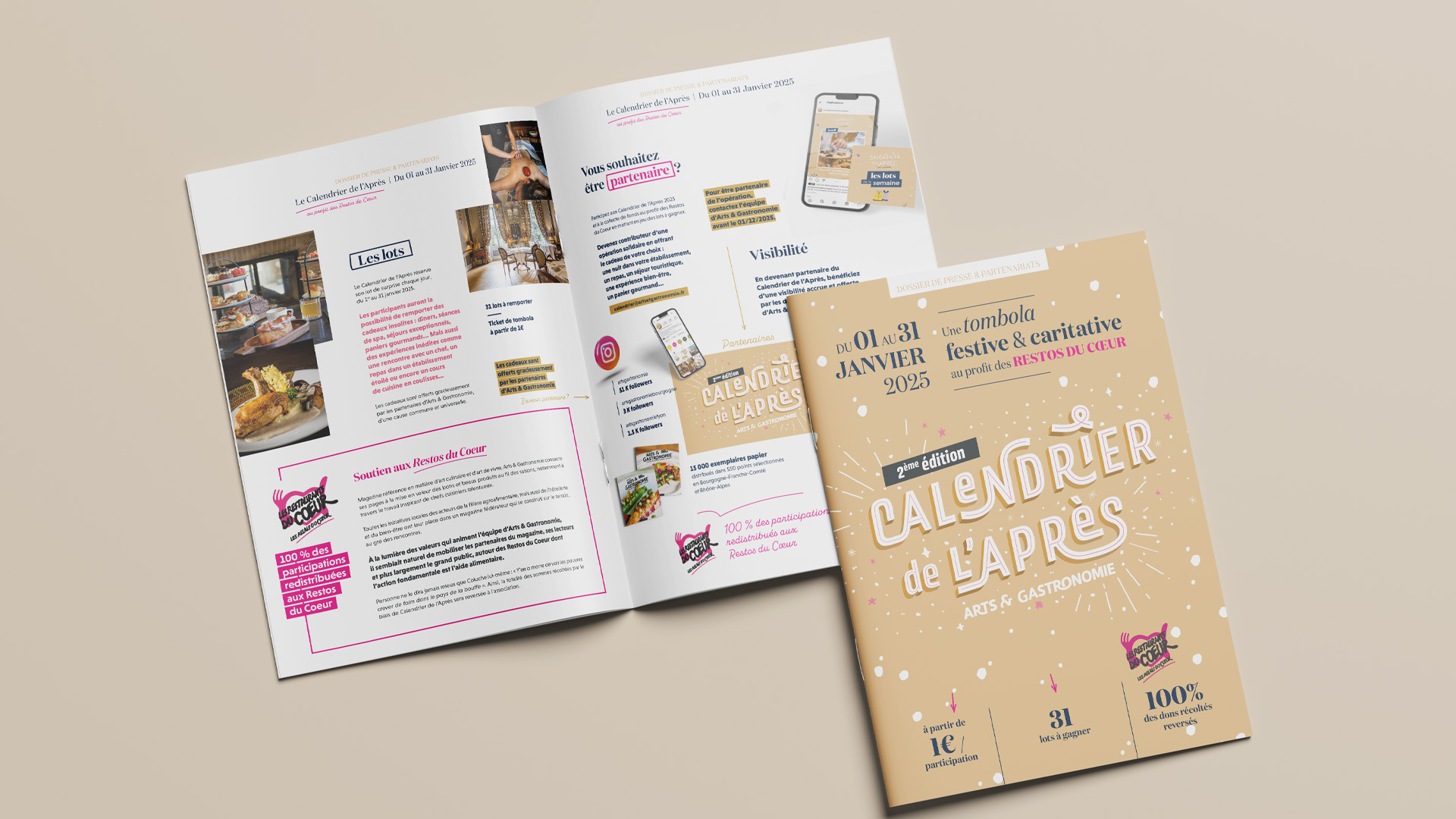 Le Calendrier de l’Après est une tombola organisée au mois de janvier et initiée par Arts & Gastronomie avec pour objectif de récolter des fonds pour les restos du cœur. Depuis 2023, nous avons a cœur de rassembler, nos partenaires, nos lecteurs et plus largement le grand public autour d’une cause universelle : la lutte contre la précarité alimentaire.