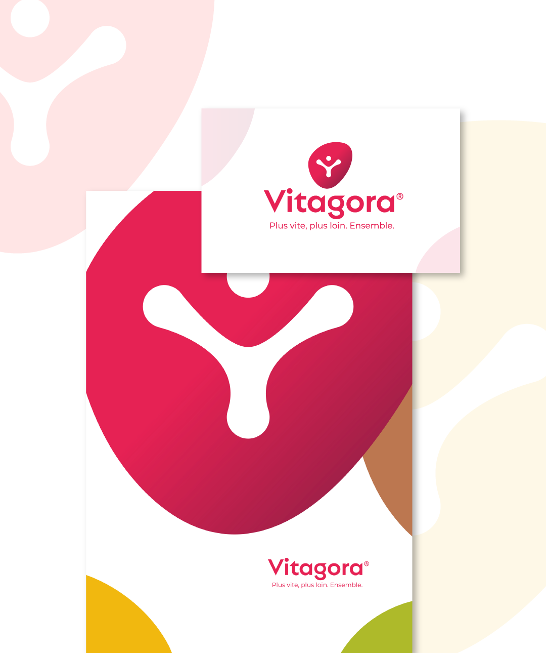 Le nouveau logotype de Vitagora reprend le symbole hérité du précédent qui évoque les idées de réseau, d’humain, de laboratoire et détache le nom de la forme. Le branding de la marque Vitagora prend vit également dans la forme organique qui accueille ce symbole. La typographie est ronde avec quelques incursions de formes triangulaires qui évoquent le dynamisme de l’association. La baseline communique les valeurs de l’association et renforce la notion de groupement. Le logotype est composé de nuances de rose qui apportent un côté acidulé et optimiste et évoquent la gourmandise. Le symbole est traité dans un léger dégradé pour apporter de la profondeur.